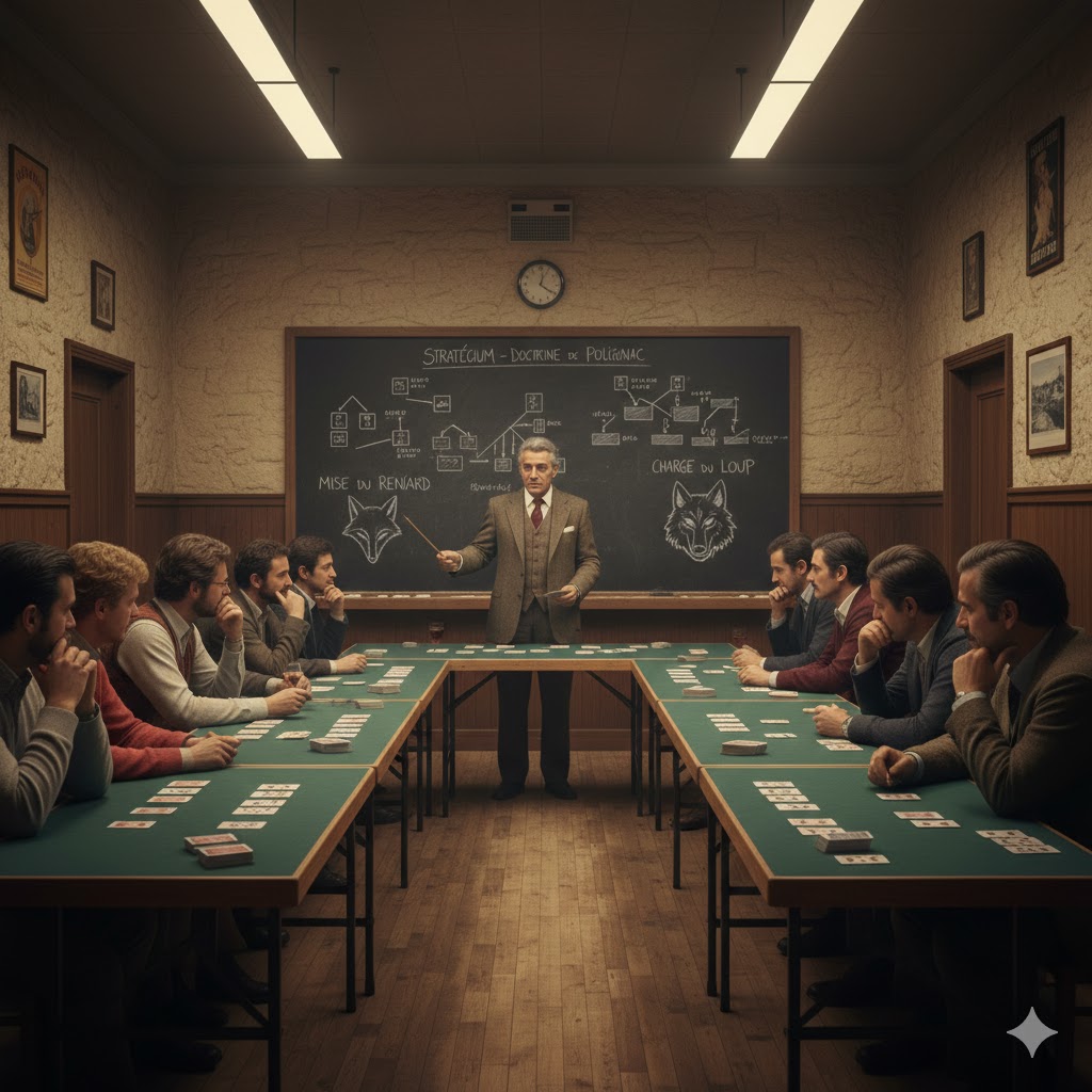 De Polignac imposa une discipline de fer, axée sur l’analyse des cartes et la psychologie de l’adversaire. Le club se réunissait dans une salle annexe de la mairie, transformée en véritable laboratoire tactique. Les joueurs ne jouaient pas pour les annonces, ils jouaient pour l’Atout, le cœur stratégique de la victoire. Le club devint rapidement une terreur des tournois locaux de la Mayenne, grâce à des stratégies secrètes, notamment la fameuse « Mise du Renard » et la « Charge du Loup » .
